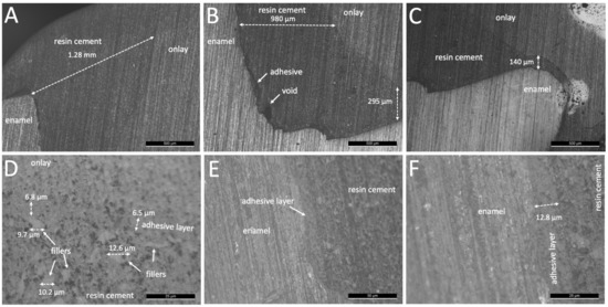 Optical microscopy images of onlay restorations cemented with BifixTM resin cement (group B) at magnification of (A–C) ×50, (D) ×1000, (E) ×500, and (F) ×1000.