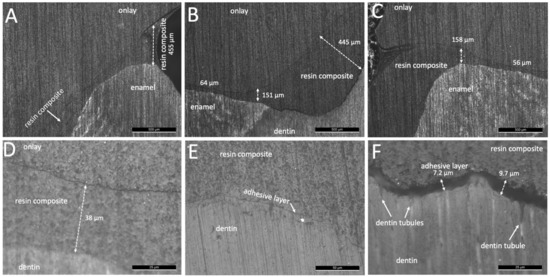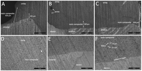 On the coronal region, the layer thickness values of the resin-matrix composite achieved up to 633 µm, while the thickness at the cervical margin was around 358 µm (Figure 5). The thickness of the resin-matrix composite layer ranged from 195 µm up to 287 µm. The adhesive layer was also noticed, as seen in Figure 5F. On higher magnification images, most of inorganic fillers were smaller than 6 µm (Figure 5F). In Figure 6, the thickness of the thermally induced flowable resin-matrix composite specimens from group V at the coronal region was recorded at 455 µm, and the cervicall margin interface revealed a thickness of around 158 µm. Low thickness values of the thermally induced flowable resin-matrix composite layer was recorded at 38 µm and 56 µm (Figure 6C,D). The thickness of the adhesive layer was measured at around 12.8 µm, as seen in Figure 6E,F.