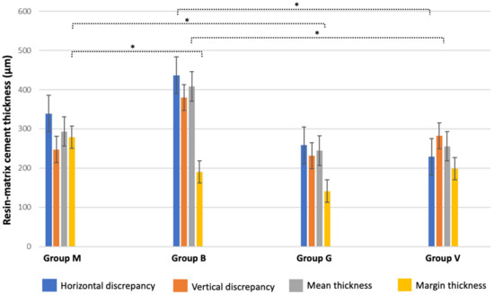 Mean values and standard deviation of the layer thickness and (horizontal and vertical) onlay margins’ discrepancies recorded for resin-matrix cements (M and B) and composites (G and V) at different parameters. Statistical differences were identified as * (p < 0.05).