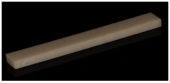 The test specimens were made of the ceramic filled hybrid material for 3D printing of permanent restorations VarseoSmile Crown plus (BEGO, Bremen, Germany) [22]. Based on ISO 178 and ISO 899-2, the dimensions were chosen to be 80 mm by 10 mm by 4 mm.