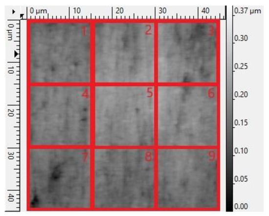 Four regions of the specimen were analyzed before and after bending. The largest change in surface roughness occurred in region 1. Therefore, it was chosen for further examination. The cut images of the first region were divided into nine segments for statistical evaluation. The AFM images are depicted in Figure 6, Figure 7, Figure 8 and Figure 9. The nine segments of the first region are visualized in Figure 10.