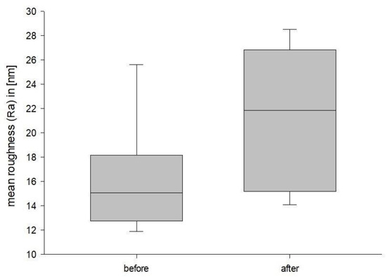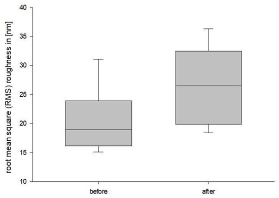 In the statistical evaluation, the confidence level was set to 95%. The Shapiro–Wilk test was passed with a p-value of 0.137 for the RMS roughness and a p-value of p = 0.114 for Ra. The paired t-test concluded that the change that occurred with the segments is greater than would be expected by chance; there is a statistically significant change of RMS roughness (p = 0.003) as well as Ra (p = 0.006). The results are summarized in Figure 11 and Figure 12.
