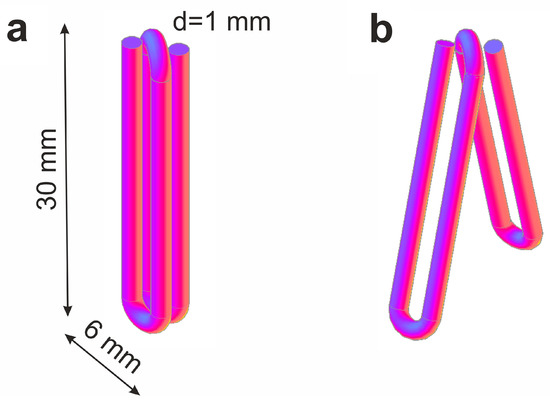As shown in Figure 1, the used clips were made of TiNi alloy and consisted of two parallel-oriented turns-branches 30 mm × 6 mm in size each. The wire cross-section diameter was 1 mm. The clips were pre-cooled at 0 °C and then, in their open state, were applied on an interstoma spur. When such a clip is warmed up to the body temperature, its branches should close, and the compression of the adjacent walls of the enterostomy inlet and outlet sections should appear. As a result of the adhesion-necrotizing process, an inter-intestinal anastomosis is formed, and patency to the intestines distal to the stoma is restored.
