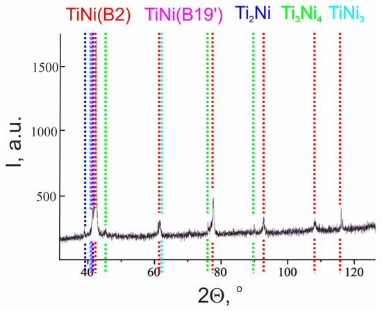 Previous studies on TiNi alloys showed that microstructurally, along with the TiNi matrix phase available in two states (B2 and B19′), the materials have secondary-phase particles of Ti2Ni, TiNi3 and Ti3Ni4 (Figure 2). The calculated content and lattice parameters of all the phases are presented in Table 1, where a phase composition typical for TiNi-based monolithic alloys obtained by induction melting followed by drawing is shown.