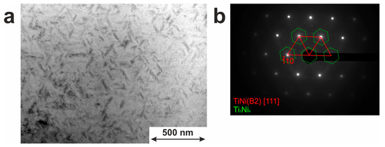 TEM revealed finely dispersed coherent particles with sizes from 10 nm to 150 nm, as well seen in Figure 4a. The average particle size was 81 nm with a standard deviation of 30 nm. SAED pattern showed the presence of Ti3Ni4 inclusions (Figure 4b). Due to their small size and coherent coupling with the TiNi matrix, such Ti3Ni4 particles are expected to contribute significantly to the behavior of the characteristic temperatures and parameters of shape-memory effects in this material.