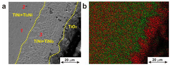 (a) Microstructure of a cross-section of the surface and subsurface layers of TiNi wire. Red numbers indicate three positions of EDX analysis with the results presented in Table 2. (b) Elemental distribution map: red for Ti and green for Ni.