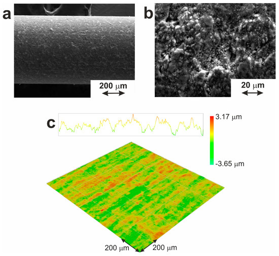 Surface morphology of TiNi wire according to (a,b) SEM, and (c) optical profilometry.