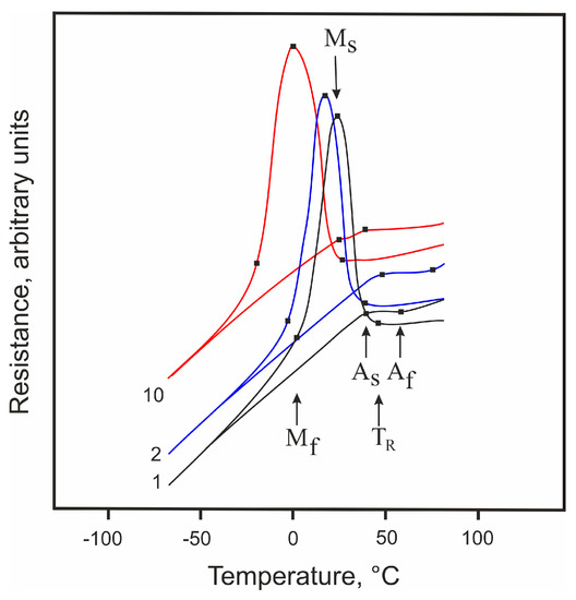 Analysis of the temperature dependences of the electrical resistance for the studied material showed that its MTs occurred in two stages, i.e., as: B2 🡪 R 🡪 B19′ (Figure 8). It can be confirmed by the characteristic rise in electrical resistance values observed at a temperature of TR = 44 °C [79]. Moreover, in the presence of fine Ti3Ni4 particles detected in the studied material (see Section 3.1), this type of phase transition (through the R-phase) is favorable. The Ti3Ni4 particles can be nucleation sites for R-phase crystals since the lattice distortion associated with the R-phase transformation (about 1%) is much smaller than that with the B19′ transformation (about 10%).
