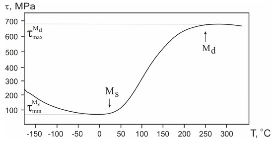 The composition of the alloy (i.e., availability of additives and/or second-phase particles) determines all possible properties it will demonstrate. When it comes to shape-memory alloys, temperature becomes another extremely important experimental parameter that governs the result. In the temperature dependence of the critical martensitic transformation stresses τ(T) presented in Figure 9, the temperature range of deformation and the degree of deformation are important indicators of the material’s properties.
