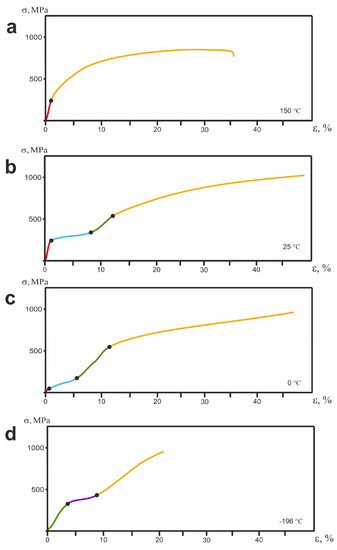 For the initial martensitic state (at −196 °C, Figure 10d), three stages can be distinguished in the σ(ε) curve: the stage of elastic deformation of martensite (green section of the curve in panel (d)), the stage of twinning (purple section in Figure 10d), and the stage of plastic deformation (orange section in Figure 10d). For the TiNi alloy at a test temperature of 25 °C (panel (b)), the deformation is seen to begin at the stage of elastic deformation of austenite (red section in Figure 10b), then it is replaced by the stage associated with the martensitic transition (blue section in Figure 10b). The next rise of the curve is characterized by elastic deformation of the martensite (green section in Figure 10b). The final stage of this dependence is the stage of plastic deformation (orange section in Figure 10b). At 150 °C (Figure 10a), the alloy is in the austenitic state, and its dependence σ(ε) visually differs from the others and is represented by only two stages: the elastic deformation of austenite and its plastic deformation (red and orange sections in Figure 10a).