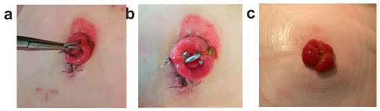 The clip was applied to the interstoma spur 14–46 days (23 days on average) after enterostomy. Indications for the use of a compression device were pathological loss of chyme (more than 20 mL × kg per day) in the presence of contraindications to the closure of the stoma. The average body weight, when applying the clip, was 3074 (2421–3900) g, the minimum being 1220 g. The clip was removed on its own on day 5 on average (from day 3 to day 7). The feces were found to pass through the anus on their own from day 1 to day 3 after the removal of the clips.