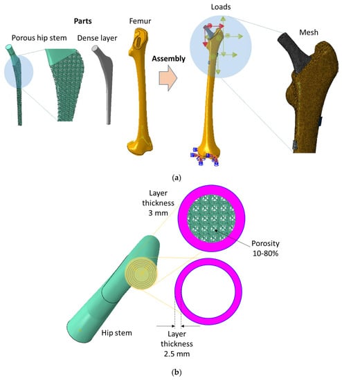 - Alkhatib, S.E.; Mehboob, H.; Tarlochan, F. Finite element analysis of porous titanium alloy hip stem to evaluate the biomechanical performance during walking and stair climbing. J. Bionic Eng. 2019, 16, 1103–1115. [Google Scholar] [CrossRef]