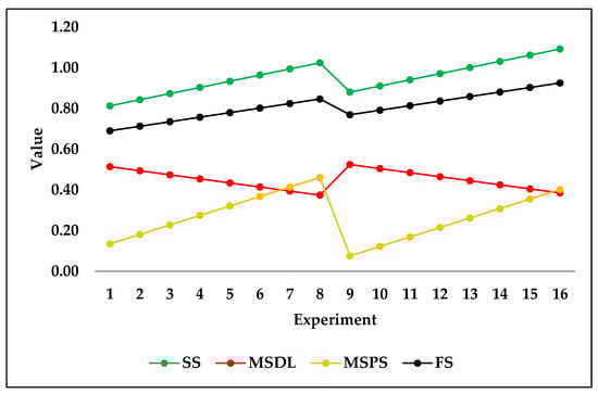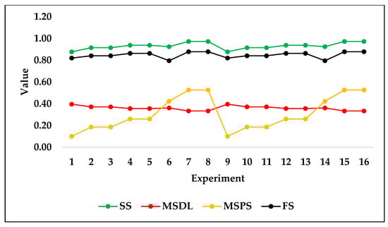 It is evident from Table 5 that the two algorithms with the best trend score are ridge and linear regression. Linear regression was excluded due to its prediction of negative values according to the second selection criterion mentioned in the methodology section. To reiterate, the criteria for choosing the best algorithm depended on two factors. The first factor is the monotonicity of the prediction, where no two consecutive predicted outputs are repeated. The second factor is the nonexistence of negative value predictions. In Table 5, a score of 0 or 1 is used to describe criteria satisfaction, where a score of 1 indicates that the criterion of monotonicity is met, whereas a score of 0 indicates that monotonicity is not met. Figure 4 shows the validation prediction of SS, MSDL, MSPS, and FS, using the ridge regression algorithm on the fourth sample seed.
