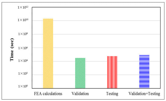 Figure 8 shows the calculation times of FEA calculations, ML validation, testing, and total ML time. Typically, it takes hours to a few days to perform finite element calculations through modeling and finite element analysis, whereas machine learning models take significantly less time. Even if machine learning training time is also taken into account, the total time required is still significantly lower than that taken for FEA calculations. Hence, machine learning models are computationally more efficient and significantly accelerate the predictions of the biomechanical performance of new designs for hip stems. In addition to time reduction, it is worth noting that these results were also obtained using a relatively small data set.