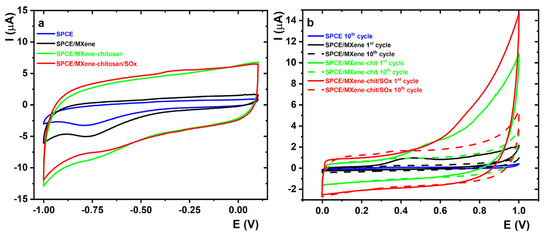 Initial electrochemical experiments were performed by running CVs in a plain 0.1 M PB pH 7.4 in potential windows from 0.1 to −1.0 V (a cathodic window) and from 0.0 to 1.0 V (an anodic window) with a scan rate of 0.1 V·s−1 using modified SPCEs. The following electrodes were examined: SPCE, MXene/SPCE, MXene–chitosan/SPCE, and SOx/MXene–chitosan/SPCE (Figure 2).