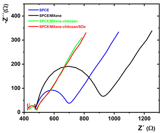 Nyquist plots of SPCE, MXene/SPCE, MXene–chitosan/SPCE, and SOx/MXene–chitosan/SPCE in 0.1 M PB containing 5 mM K3[Fe(CN)6] and K4[Fe(CN)6]·3H2O. Results are presented in the form of a Nyquist plot with equivalent circuit R[Q(RW)] applied for data fitting.