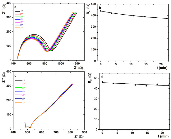 Nyquist plots of (a,b) MXene/SPCE and (c,d) MXene–chitosan/SPCE in 0.1 M PB pH 7.4 containing 5 mM K3[Fe(CN)6] and K4[Fe(CN)6]·3H2O with measurements repeated 7 times. Results are presented in the form of a Nyquist plot, with an equivalent circuit R[Q(RW)] applied for data fitting. The duration of the 7 subsequent EIS analyses was approximately 22 min.
