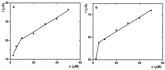 In comparison with our previous study, several differences could be observed when working with SOx/MXene–chitosan/SPCE biosensor compared to SOx/MXene–chitosan/GCE device [43]. Significant differences in the values of the current responses were recorded. In the case of SPCE-based detection platform, they were about 19 times higher (1.21 × 10−5 A in the presence of 2.5 μM sarcosine) in comparison with those of GCE-based biosensing (6.38 × 10−7 A in the presence of 2.5 μM sarcosine). Changes in the current responses could be attributed to the properties of the carbon working-electrode material. The fitting of the calibration curve revealed two different ranges in which the calibration curve was linear for both types of measurements (Figure 5).
