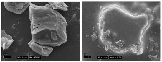 Scanning electron microscopy images representing (left) pristine multilayered Ti3C2TX MXene structure, 40,000× and (right) Ti3C2TX MXene@chitosan composite, 20,000×.