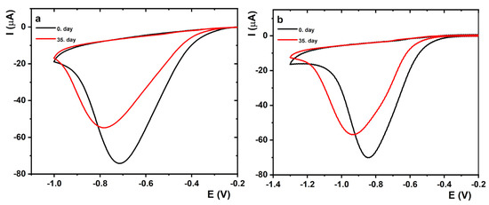 To investigate the long-term stability of the prepared SOx/MXene–chitosan/SPCE device, CV measurements in the presence of 30 µM sarcosine in the potential window from 0.1 to −1.0 V and 0.1 to −1.3 V in the cell and in a 100 µL droplet, respectively, were performed (Figure 7). All prepared devices were stored in the refrigerator throughout the experiment.
