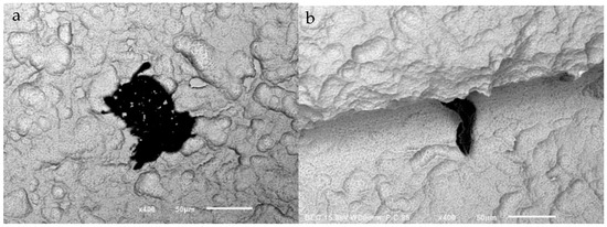 SEM images of two particles at (400×) magnification on Cortex dental implants. Large heterogeneous particle with smaller particles on its surface (a) and a uniform, well-defined particle (b).