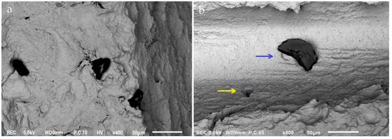 SEM images of two particles at (400×) magnification on Keystone dental implants. Three particles surrounded by smaller particles (a) and one large particle (blue arrow) with a smaller particle (yellow arrow) (b).