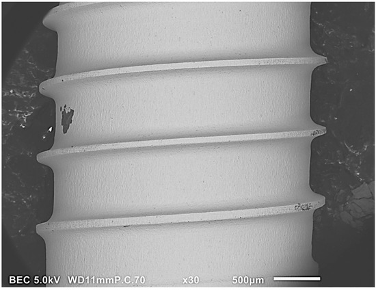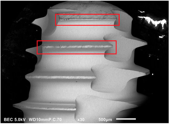 SEM Image (30×) on Zimmer Biomet dental implants. “touch-like” contamination at the apex (upper rectangle) and external thread (lower rectangle).