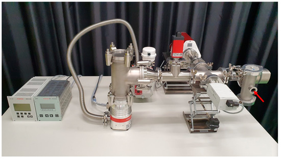The backing vacuum of 2 × 10−2 hPa required to operate the turbomolecular pump is generated by a two-stage rotary vane vacuum pump (Duo 3M; Pfeiffer Vacuum, Wetzlar, Germany). The backing and high-vacuum pumps are connected via a metal shaft hose (ISO-KF; Pfeiffer Vacuum AG, Wetzlar). The control valve for the gas inlet into the measurement setup is controlled by a control unit (RVC 300; Pfeiffer Vacuum, Wetzlar) which, in conjunction with a Bayard–Alpert type ionization vacuum gauge, forms a control loop and ensures the constant measurement of the volume flow. The measuring principle is independent of gas type, so that incorrect measurements cannot occur when different measuring, test, or purge gases are used. The measuring tube is flanged directly into the volume flow of the measurement setup by means of a T-piece between the crosspiece of the mass spectrometer and the metering valve. A measuring chamber or sample holder can be attached to the gas inlet of the gas control valve by means of an ISO-KF flange.