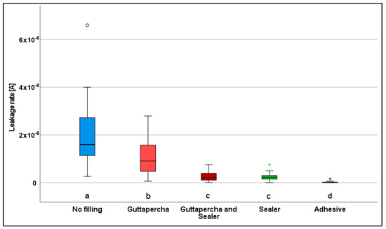 In study group III, the use of a sealer between the gutta-percha post and the canal wall was intended to supplement possible inaccuracies. Statistically significantly lower leakage rates were detected in this group in comparison with the first two groups, with a median value of 1.9 × 10−9 (min. 4.0 × 10−11, max. 7.5 × 10−9, interquartile range 2.6 × 10−9) (p < 0.05).
