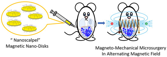 This paper investigates a novel “smart nanoscalpel” tool for microsurgery of intractable ascites tumors. Three-layer MNDs with a quasi-dipole structure (Au/Ni/Au), functionalized by DNA aptamers specific for ascites tumor cells, are remotely controlled by a specific MF. Due to the aptamers, MNDs find and precisely kill tumor cells without damaging healthy ones in a safe alternating MF (AMF) that transforms a magnetic moment into a mechanical one. The general scheme of MMM is shown in Figure 1.