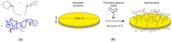 Secondary (i) and tertiary (ii) structure of the AS42 aptamer. The 5′- and 3′ ends are colored purple and cyan, respectively (a). Functionalization of MNDs with oligonucleotides. The yellow layers are aurum, and the gray layer is nickel (b).