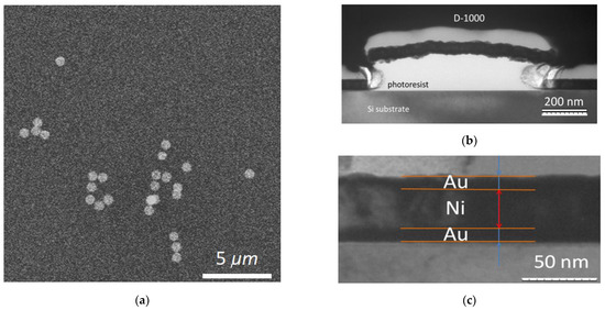 The MNDs structures are presented in Figure 3a, where the non-agglomerated disks of an equal diameter of 1 μm are visible. The thickness of the layers was refined using transmission electron microscopy in the cross-section mode (see Figure 3b,c). It can be seen from the TEM data that MNDs are slightly curved. The thickness of the metal layers, counting from below are: Au—11.25 nm, Ni—32.5–34 nm, and Au—5.5 nm. The total thickness of the metal layers of the MND is about 50 nm. The gold layers look darker on a transmission microscope (see Figure 3c).