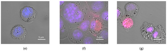 Confocal laser scanning microscopy demonstrated that healthy EAC cells (Figure 5e) after AS42–MND-based MMM lost membrane integrity; some of them enlarged (Figure 5f) and underwent necrosis (Figure 5f,g). DAPI stained viable cells’ nuclei (Figure 5e) and became red in necrotic cells because the fluorescence dye propidium iodide penetrated the cell through the broken membrane (Figure 5f,g). The selectivity of the AS42–MND-based MMM has been demonstrated in mice mesenchymal cell cultures. MMM did not influence these cells and did not cause necrosis (Figure S3).