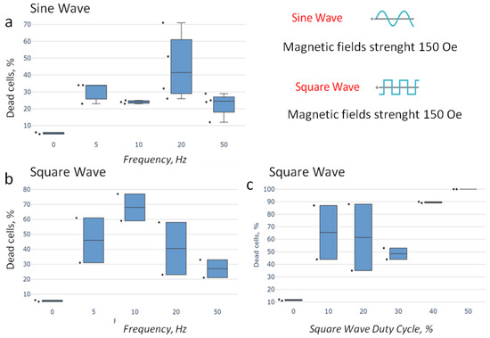 The influence of a rectangular-shaped AMF was studied with a 0.5 constant duty cycle (Figure 6).