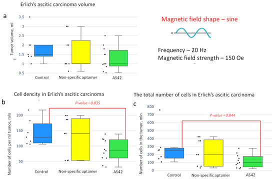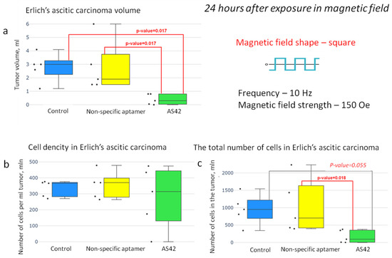 Effectiveness of the “smart nanoscalpel” as an instrument for destroying ascites tumors in vivo using a square-shaped AMF with a frequency of 10 Hz and a duty cycle of 0.5 (24 h after exposure in the magnetic field); (a) tumor volume effect, (b) cell density effect, and (c) the total number of cells in the tumor effect.
