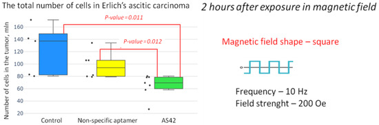 The targeting of the “nanoscalpel” was achieved by functionalizing MNDs with the DNA aptamer AS42, which were used as bio-identifying molecules. Electron microscopy showed that the MNDs penetrated the ascites cells. Based on the literature, the penetration of magnetic disks into the cell is carried out by endocytosis followed by encapsulation in lysosomes [36]. In this case, it is assumed that the lysosomal membrane rupture under the influence of an AMF is the leading cause of cell death. At the same time, the penetration of disks into the cells without the influence of an AMF does not reduce the viability of the tumor cells [26]. Their penetration begins with the interaction with cell membrane proteins, which are specific targets for the AS42 aptamer.