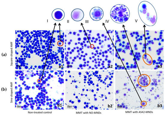 Morphology of EAC cells in mice after MMM in a square-shaped (a) and sine-shaped (b) AMF at a frequency of 10 Hz, a duty cycle of 0.5, and a field strength of 150 Oe in vivo. Panel (a1, b1) corresponds to non-treated controls, (a2, b2) to NO-MNDs, and (a3, b3) represents cells from AS42–MNDs. I—ascitic cell; II—ascitic cell with the damaged membrane; III—ascites cell in the blebbing state; IV—ascitic cells and apoptotic bodies; V—ascitic cell and cells with the damaged membranes. 20× magnification.