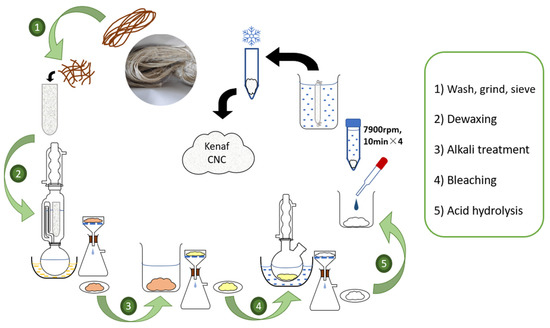 The CNCs were prepared from raw Grade A kenaf fibers (SKM2—Bio Grade A) purchased from National Kenaf and Tobacco Board, Kota Bharu, Kelantan, Malaysia. Figure 1 shows the extraction of kenaf CNC from raw kenaf fibers. Running filtered water was used to wash and rinse the samples and dried them at 50 °C for 24 h. Fibers were then milled and separated through a 100-mesh sieve. Fibers above the sieve size of 63 µm, and below the sieve size of 150 µm were excluded, limiting the size between 63 and 150 µm [24].