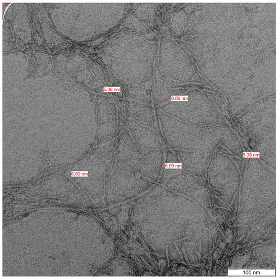 Prior to assessment under TEM, the kenaf CNC was sent for scanning electron microscopy (SEM). The nano size of the CNC was not measurable under SEM due to agglomeration. The kenaf CNC was rod-like and presented a network structure similar to a web following TEM analysis. Overall, the kenaf CNC displayed a diameter that ranged between 5.38 nm and 8.09 nm, with a mean of 6.31 nm (Figure 3). This appearance of kenaf CNC aligns with the findings of Nuruddin et al. [27], in which a mean diameter of 6 nm was documented after characterization. The CNC lengths could not be measured under TEM following undiscernible ends and overlapping samples of elongated curved nanofibers, in line with the Nuruddin et al. [27] report. This finding stems from the agglomeration owing to strong inter-fiber hydrogen bonding. Nevertheless, CNC was successfully isolated from kenaf cellulose for utilization in various applications.