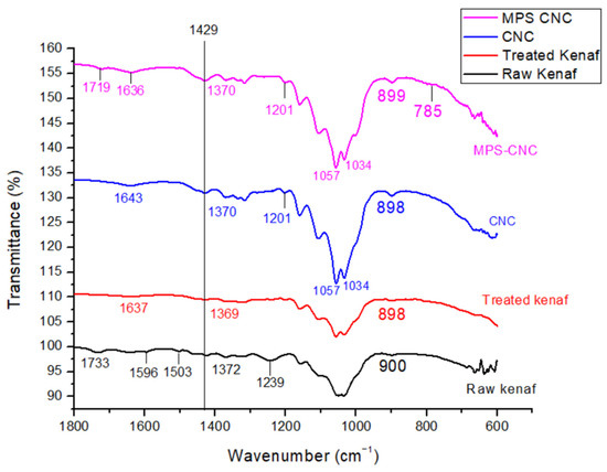 Close-up FTIR spectra (1800–600 cm−1) of raw kenaf, kenaf cellulose, kenaf CNC, and MPS-CNC.