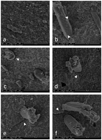 SEM images of K0, K1, K2, K3, K4, and K6 fracture surface under 5000× magnifications; (a) K0 sample illustrates the absence of porosities and regular surface topology; (b) irregular surface topology can be seen in the K1 sample, suggesting crack deflection mechanism, as well as specks of particulates attached on pulled-out fibers (white arrow); (c) K2 sample shows adhesion failure as well as a microscopic gap circumferentially around CNC (white arrow); (d) K3 sample shows CNC acting as a crack stopper (white arrow); (e) K4 sample shows CNC with deflection of crack propagation (white arrow)—specks of particulate are also apparent in CNC; (f) K6 sample shows pull-out CNC with attached specks of particulates, as well as a termination of crack propagation at CNC (white arrow).