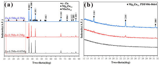 The Zn-Mn-Mg alloys’ XRD diffraction patterns (a) and Mg2Zn11 (b).