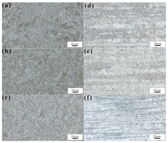 The Zn-0.5Mn-xMg alloy’s OM images. (a,d) x = 0.05 wt.%, (b,e) x = 0.2 wt.%, and (c,f) x = 0.5 wt.%.