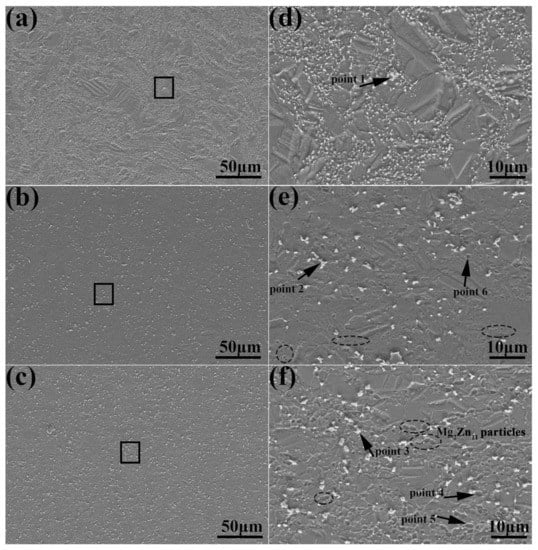SEM images of the Zn-0.5Mn-xMg alloy at x = 0.05 wt.% (a,d), x = 0.2 wt.% (b,e), x = 0.5 wt.% (c,f) and (d–f) are local enlarged images of (a–c) respectively.