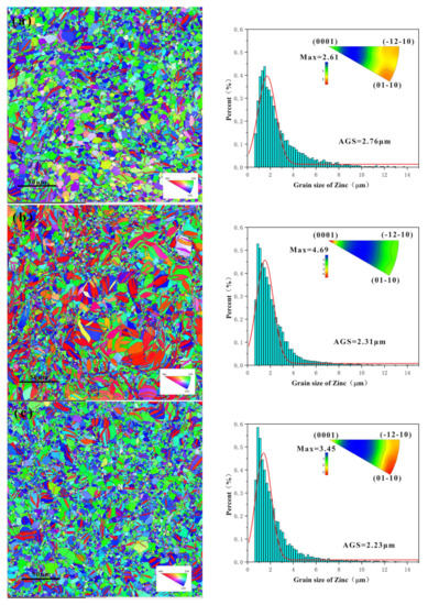 It can be seen that the white particles contained zinc and manganese, and the black particles contained zinc and magnesium (Figure 4 and Table 2). The zinc/manganese atomic ratios at points 1, 2, and 3 were 13.47, 20.39, and 17.42, respectively, and the zinc/magnesium atomic ratios at points 4, 5, and 6 were 5.86, 5.03, and 6.12, respectively. Therefore, the white particles were preliminarily determined to be MnZn13, and the black particles were Mg2Zn11 [30]. The circle marks Mg2Zn11 phase in the Figure 4e,f. Figure 5 shows that during the extrusion stage, the alloys with the highest and lowest magnesium experienced dynamic recrystallization and had more equiaxial grains than alloy with medium magnesium content. The average grain size distribution tended to shrink and it reduced from 2.76 μm to 2.23 μm when the magnesium content rose from low to high. The average grain size decreased by 23.7%. The three alloys’ inverted pole figures revealed that the as-extruded alloys all had a weak texture of <0001>. The strength of texture was related to grain refinement, amount ofMg2Zn11, and recrystallization factors [30,31].