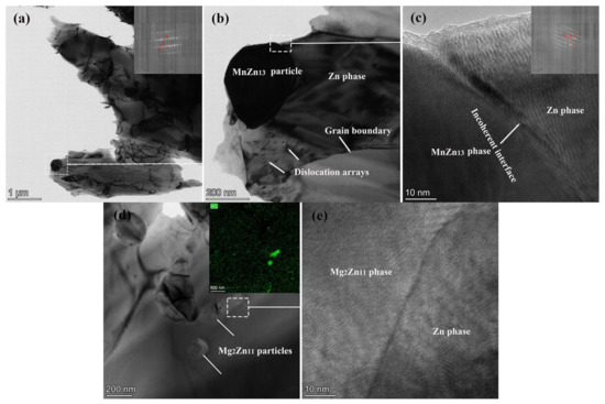 TEM micrograph of the Zn-0.5Mn-xMg alloy. (a–c) 0.05 wt.%, (d,e) 0.5 wt.% and (b,c,e) are the partial enlarged views of (a,b,d) respectively.