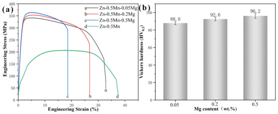 Engineering strain–stress curves(a) and hardness(b) of the Zn-Mn-Mg alloy.