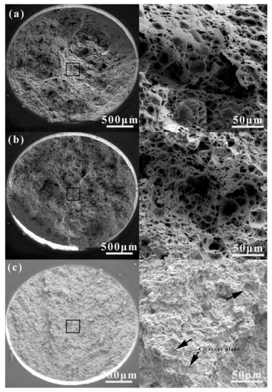 The strength and hardness of all alloys increased with increasing magnesium content, whereas the elongation decreased (Figure 8). Obviously, Compared with Zn-0.5Mn alloy, magnesium can observably increase strength and hardness when added, and the elongation can be maintained at above 15% [23,31]. Values for Vickers hardness, ultimate tensile strength, and yield strength increased from 88.0 HV0.2, 336.8 ± 18.0 MPa and 257.3 ± 14.1 MPa to 96.2 HV0.2, 369.6 ± 11.2 MPa, and 283.3 ± 8.1 MPa with increased magnesium content (a 9.3%, 9.7%, and 10.1% increase, respectively). Elongation decreased from 27.1 ± 6.9% to 17.4 ± 2.4% correspondingly (a 55.7% decrease). The mechanical properties of the three alloys are listed in Table 3. However, these results indicated that the changes in the number and size of Mg2Zn11 were the reasons for the hardness and brittleness of alloys. The fracture morphology clearly illustrates the transition of alloys from ductile fracture to brittle fracture, Figure 9. Among them, the Zn-0.5Mn-0.05Mg was a typical ductile fracture, and the fracture surface had more and deeper dimples. Although dimples also appeared in Zn-0.5Mn-0.2Mg, the dimples were obviously shallower, and the fracture surface had obvious torn edges, inclusions, river pattern strips, and “quasi-cleavage” planes [33]. This is a typical ductile–brittle hybrid fracture. However, when the magnesium content reached 0.5 wt.%, the elongation of the alloy decreased by less than 20%. This was because of the brittle fracture and transgranular fracture caused by the deformation of the surrounding matrix caused by the separation of Mg2Zn11 particles from the metal matrix [34,35].
