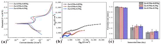 Polarization curves (a), EIS spectrum (b), and immersion corrosion rate (c) of the alloys in SBF.