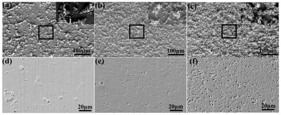 SEM images of the Zn-0.5Mn-xMg alloys after immersion for 30 days without removing the corrosion products and after cleaning the corrosion products with (a,d) 0.05 wt.%, (b,e) 0.2 wt.%, and (c,f) 0.5 wt.% Mg additions.